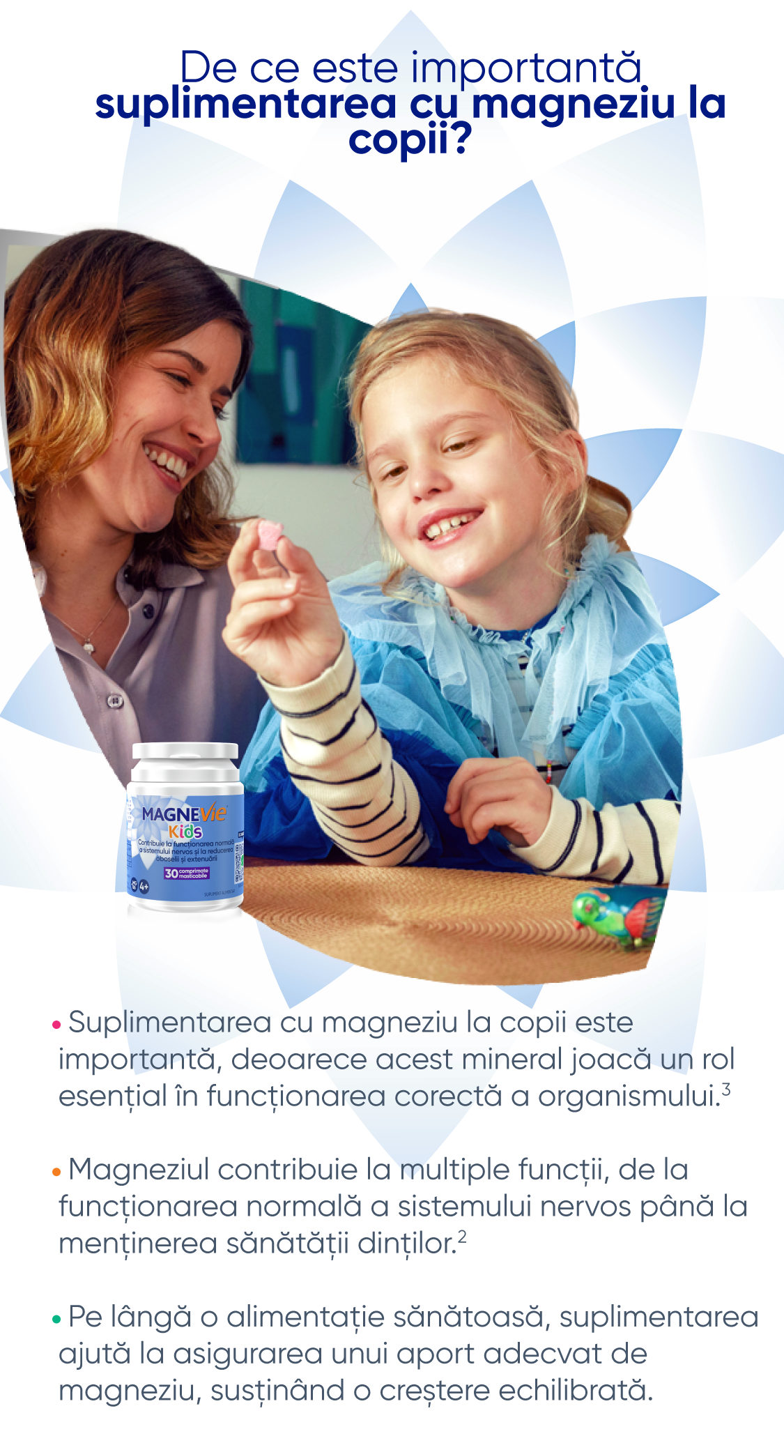 Magneziul este unul dintre nutrienții cheie care asigură funcționarea corectă a organismului3, ideal pentru copiii ce trec prin puseuri de creștere.